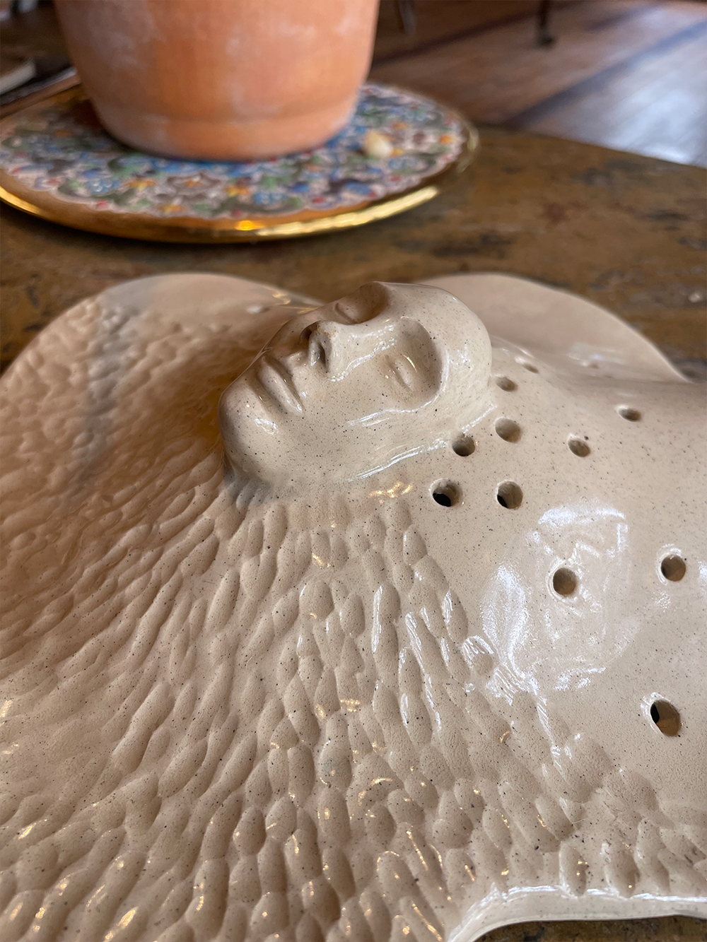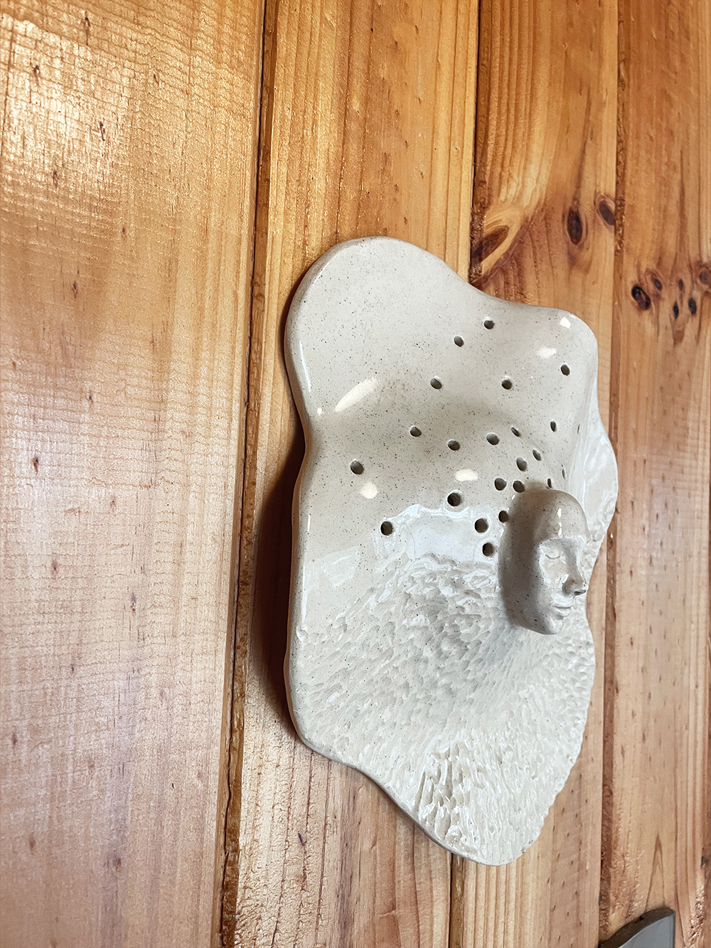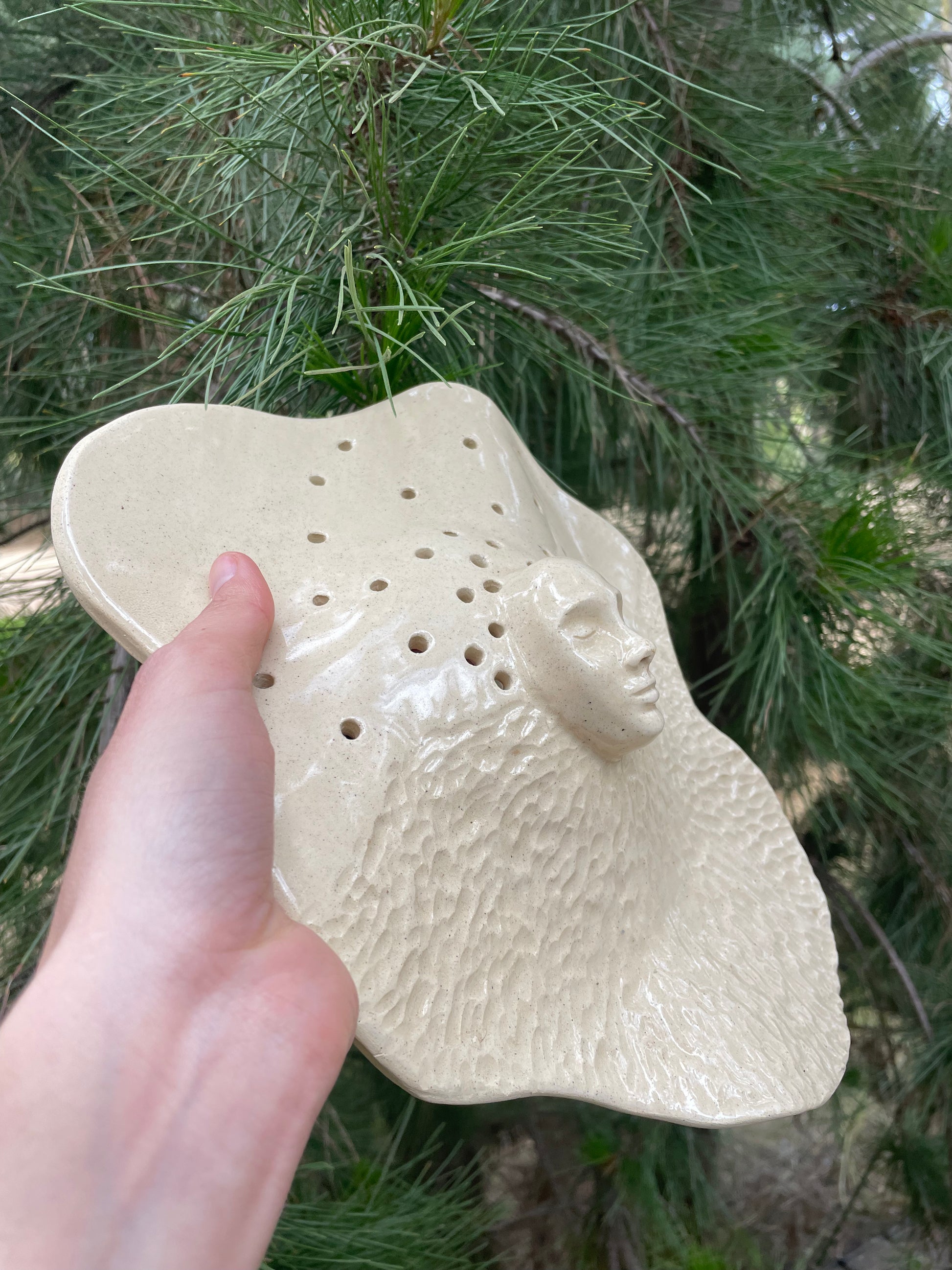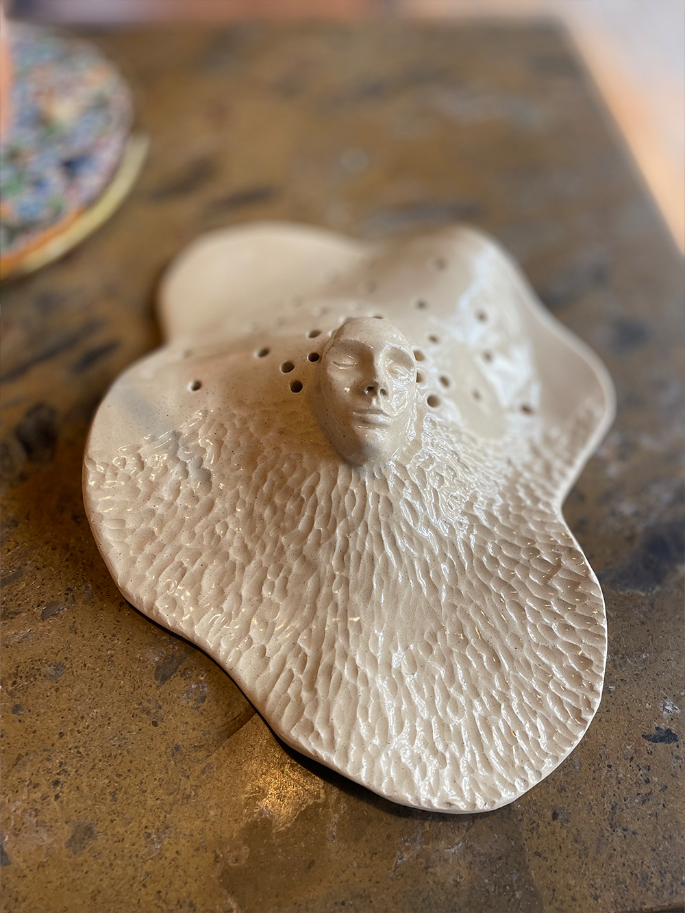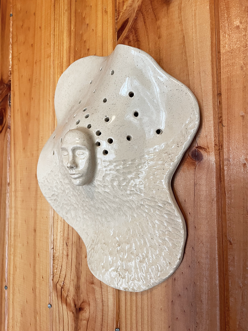 Escultura fluida y versátil, rostro que nace del centro y desde el se despliega la energía. Pensado para ser colgado como apliqué y poner luz dentro de él. También de desenvuelve bien como adorno en una mesa. Hecho en cerámica gres con esmalte jaspeado.