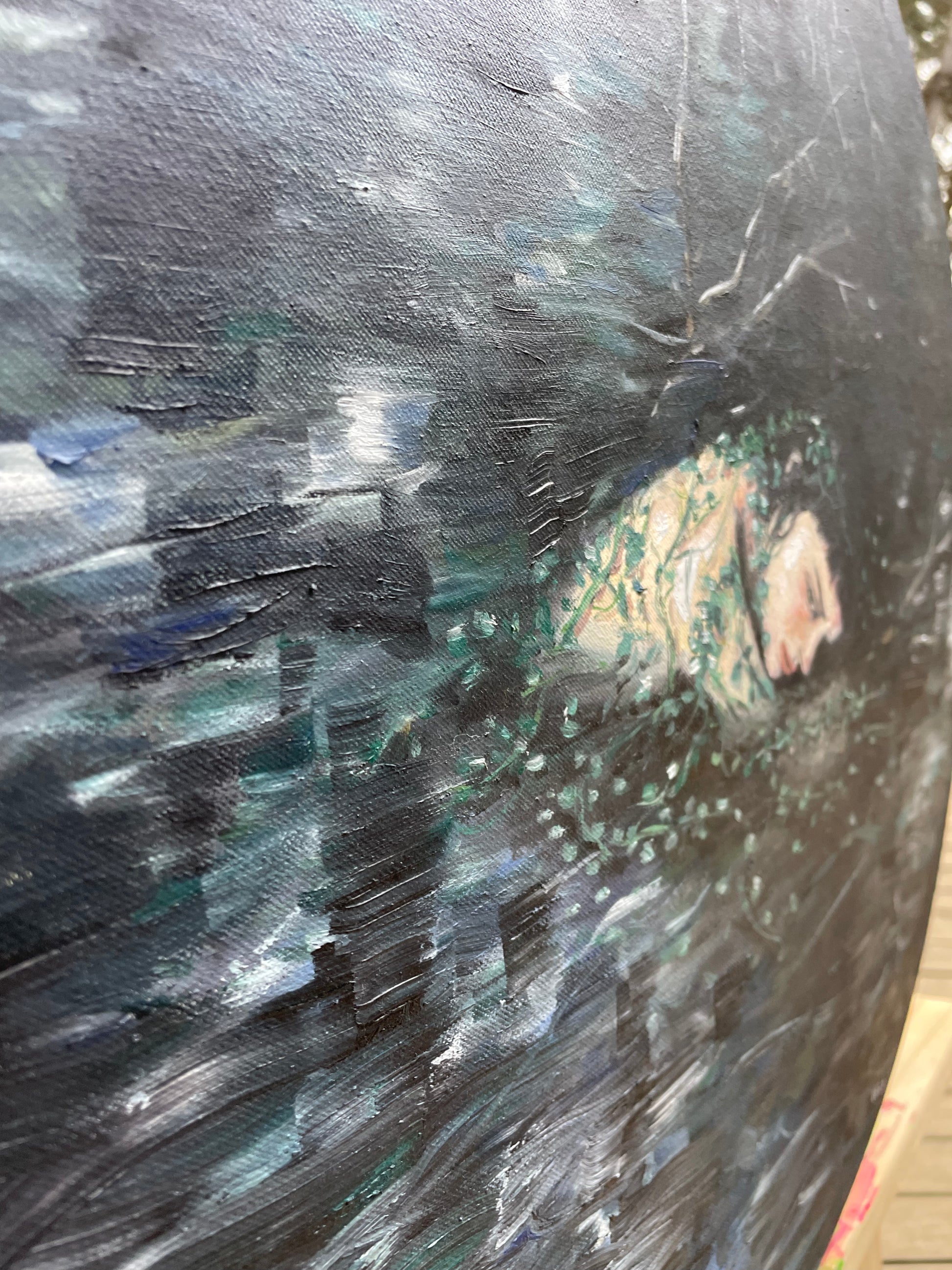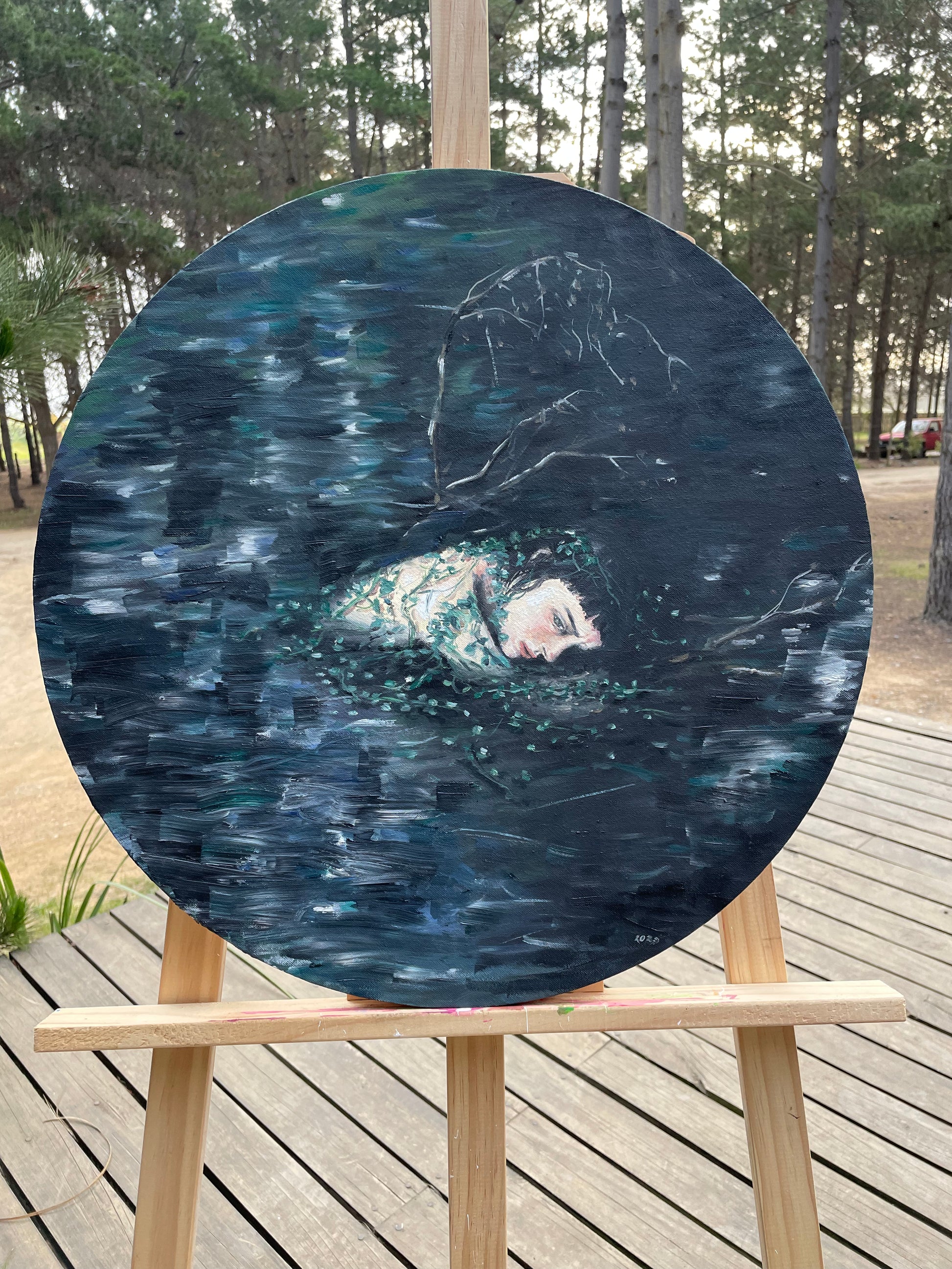“Fundida” es una pintura en bastidor redondo, que hace alusión a cómo la naturaleza puede reflejar nuestro sentir