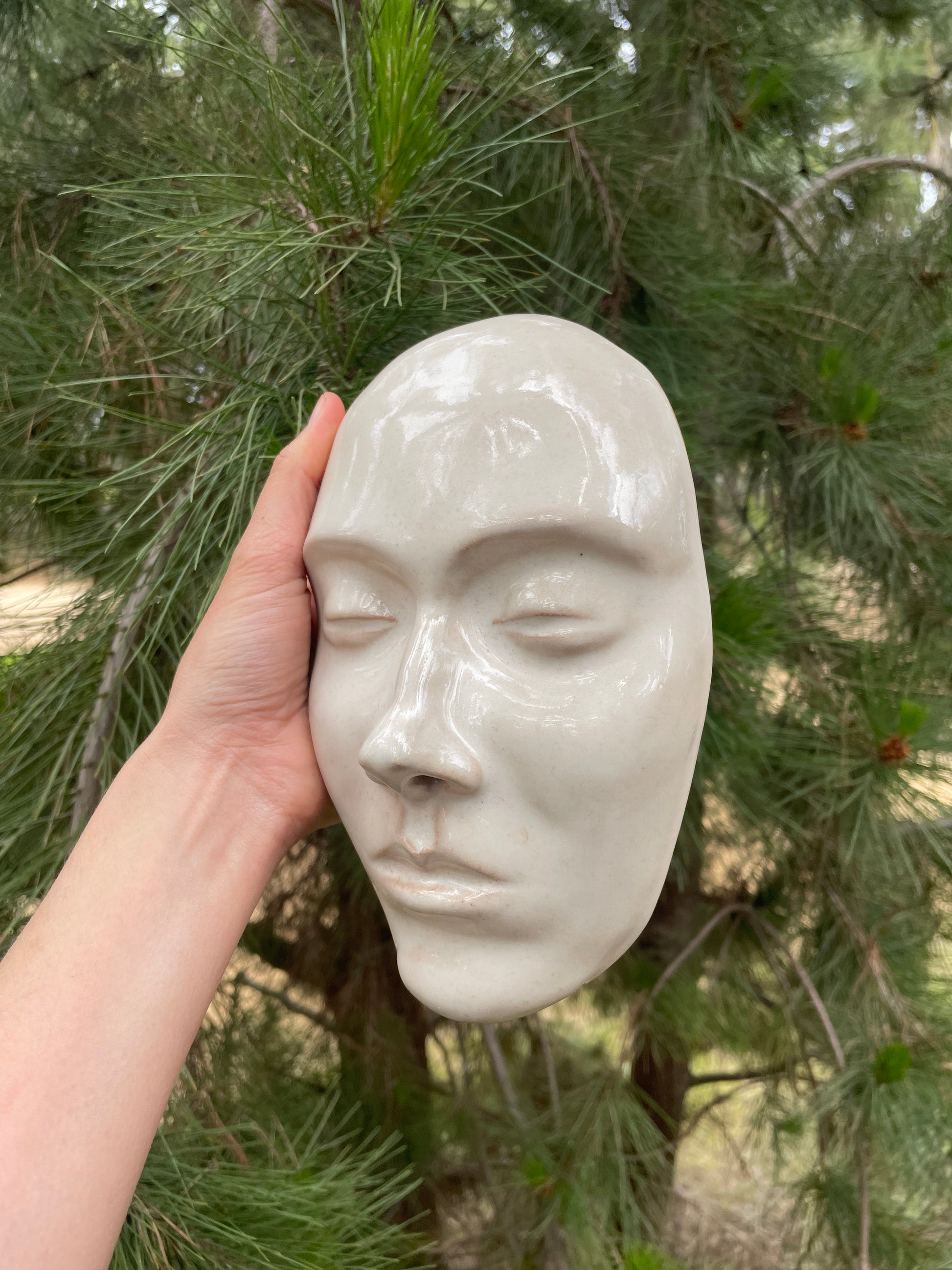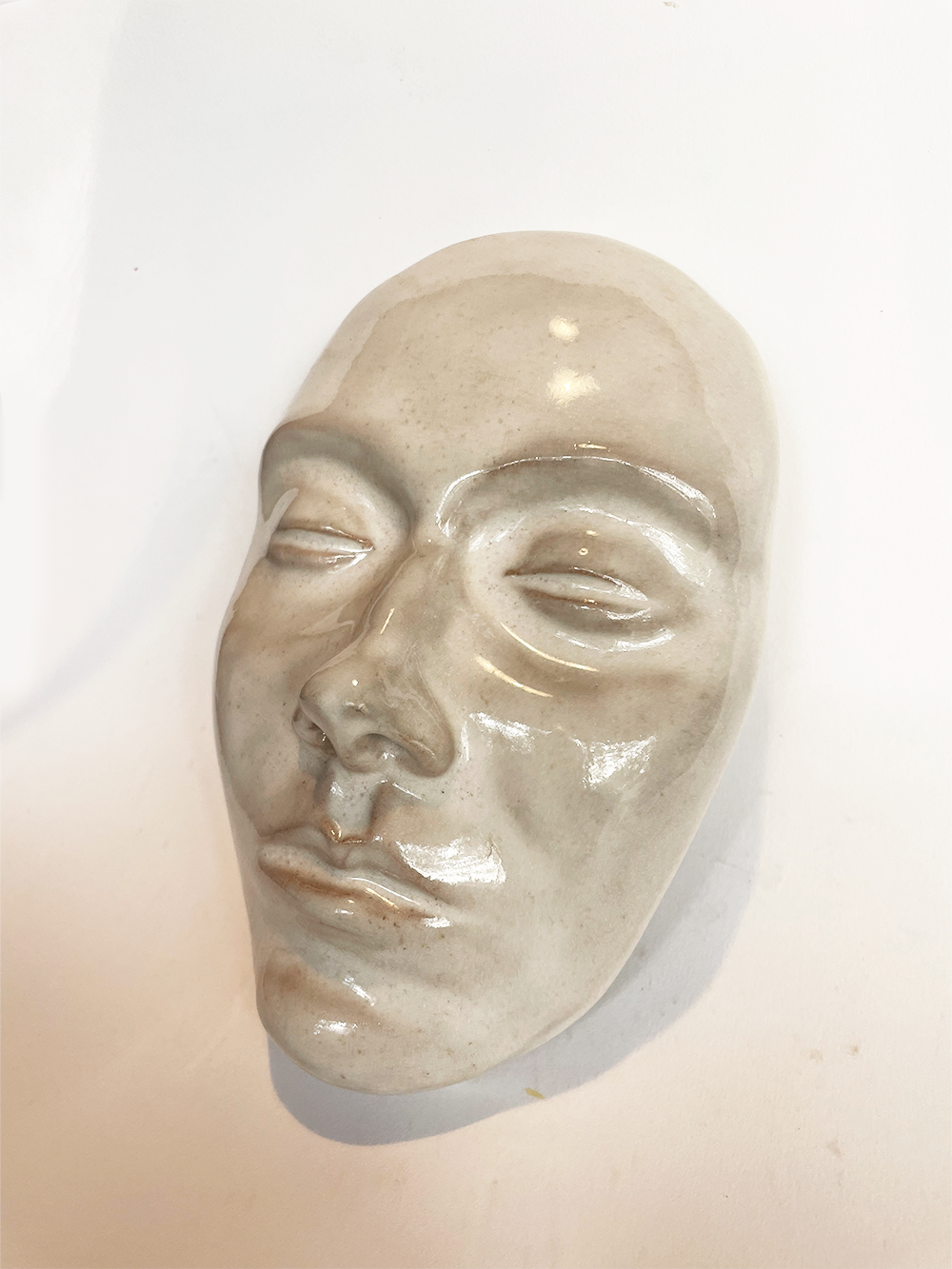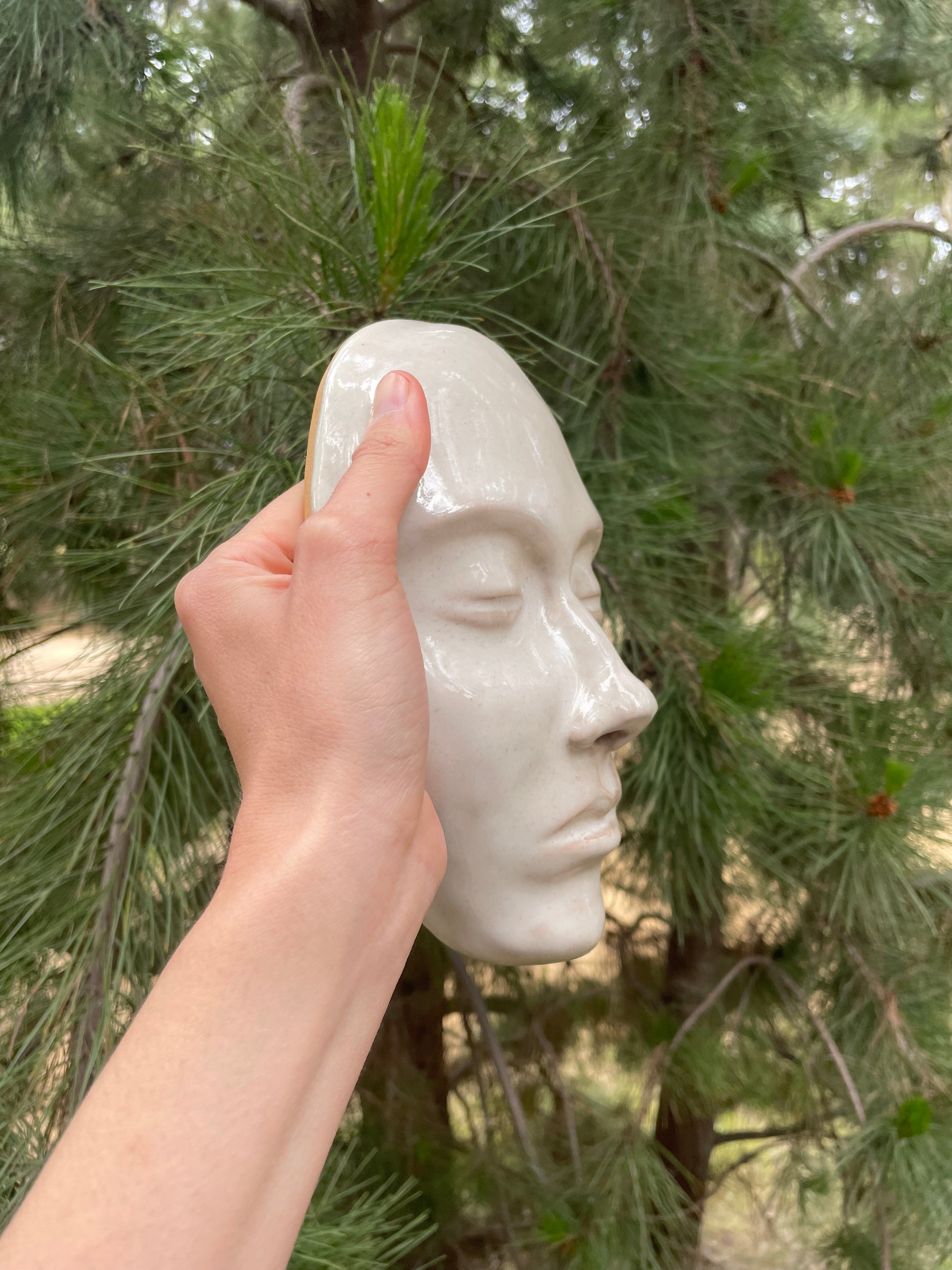 Delicado rostro esculpido a mano hecho con cerámica gres de tono tostado, bañado en un esmalte blanco jaspeado.