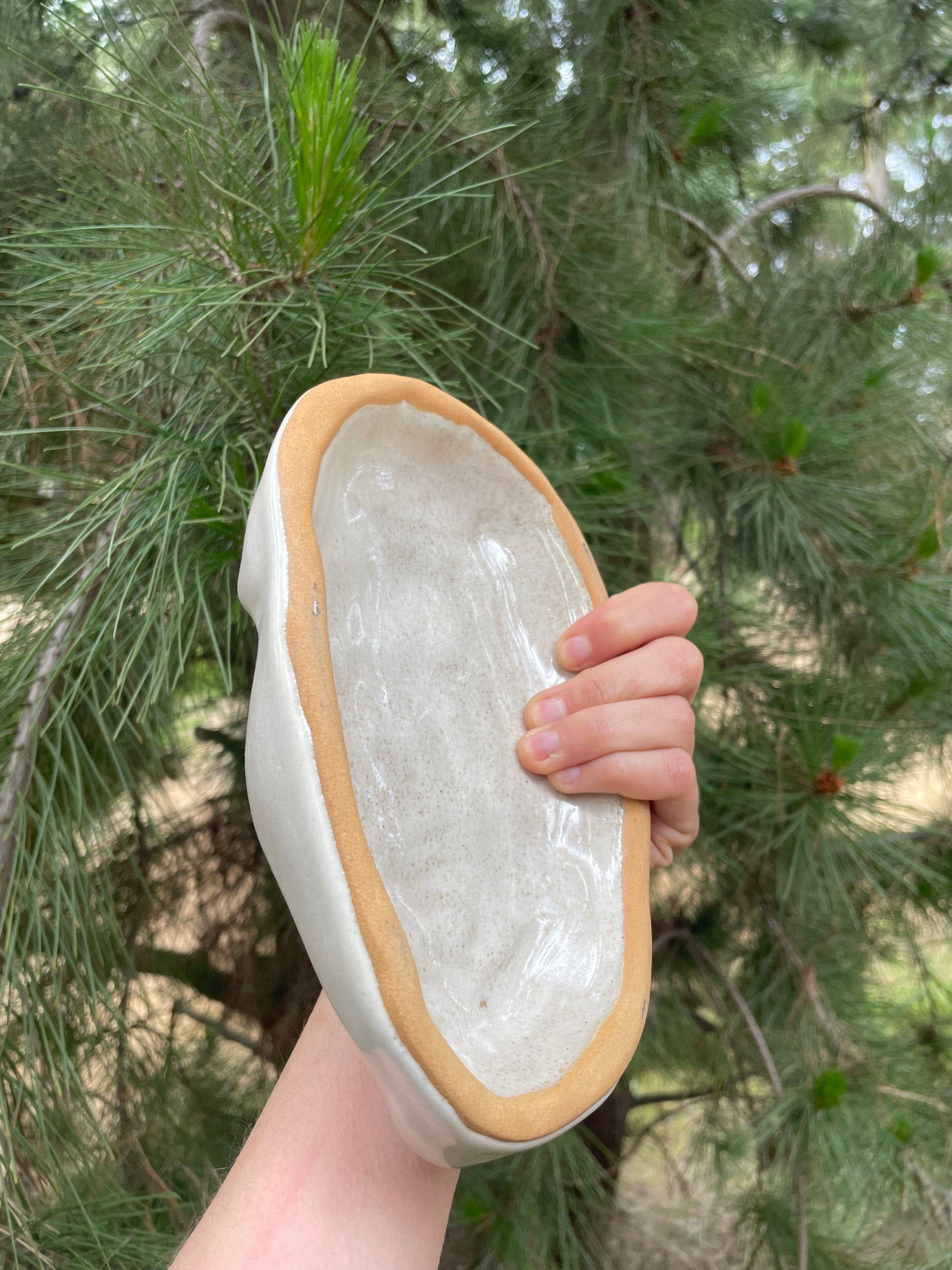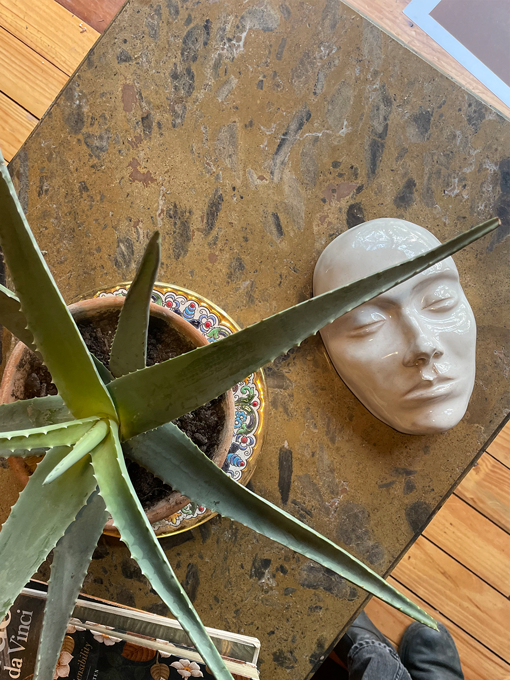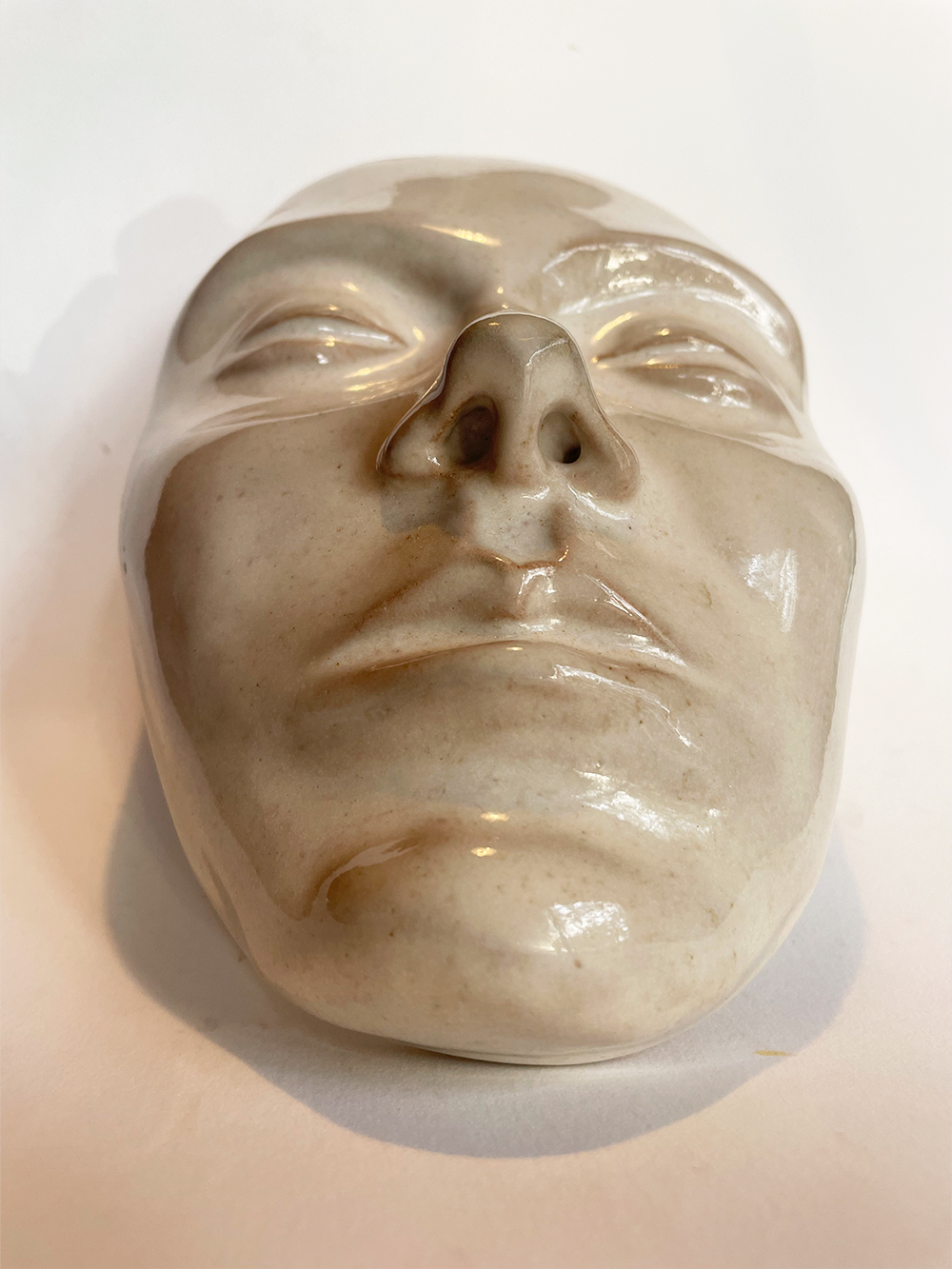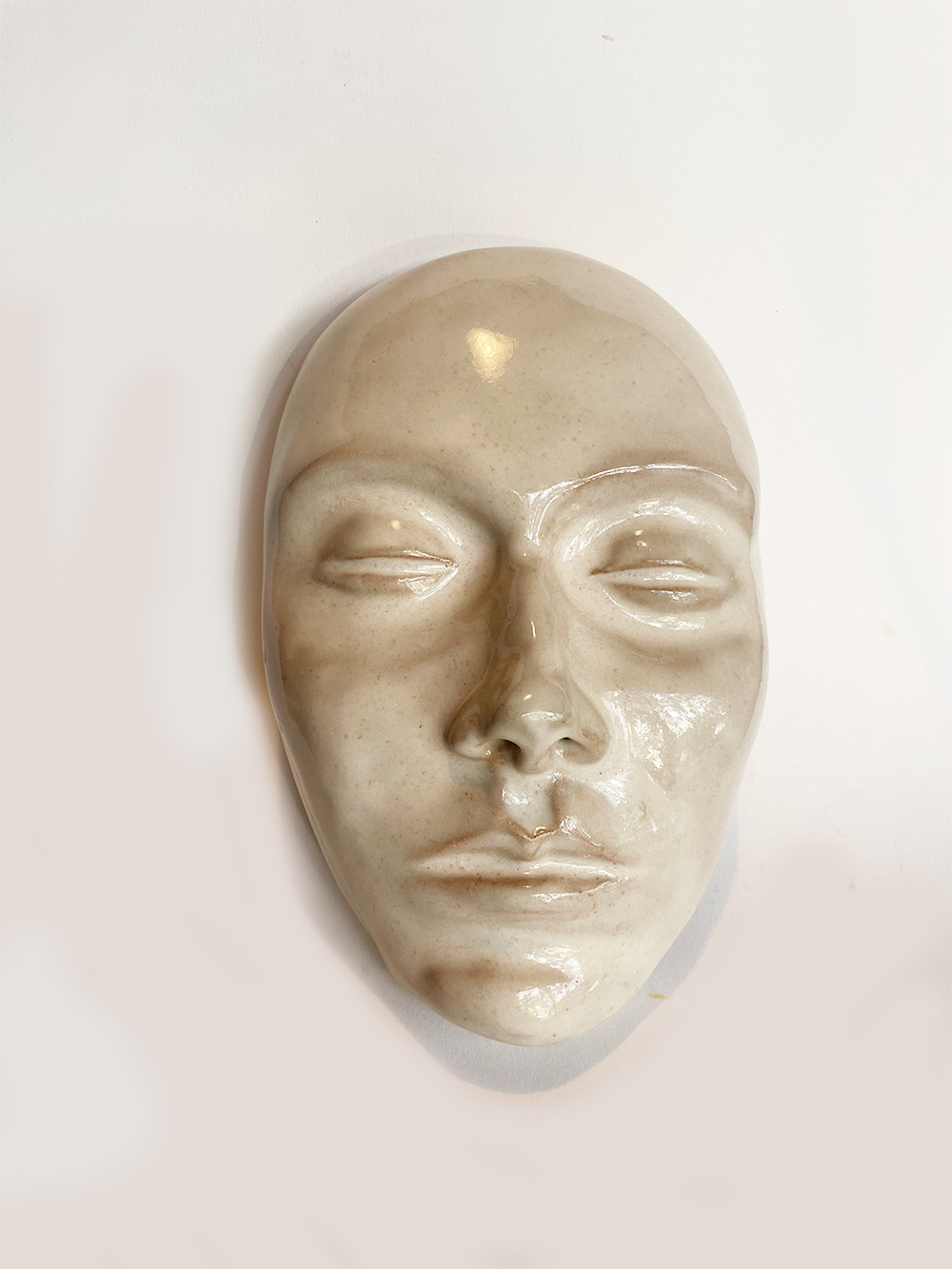 Delicado rostro esculpido a mano hecho con cerámica gres de tono tostado, bañado en un esmalte blanco jaspeado.