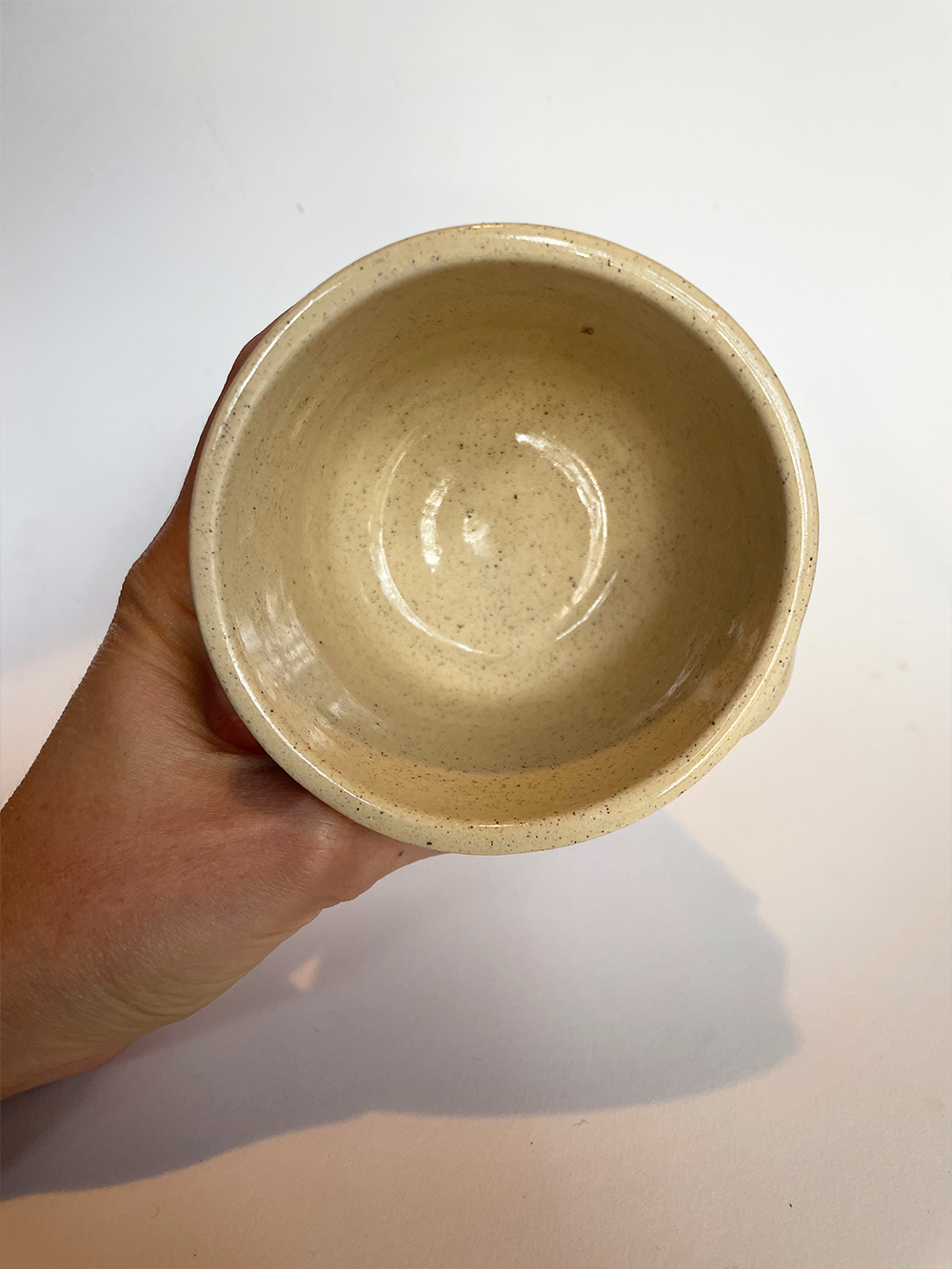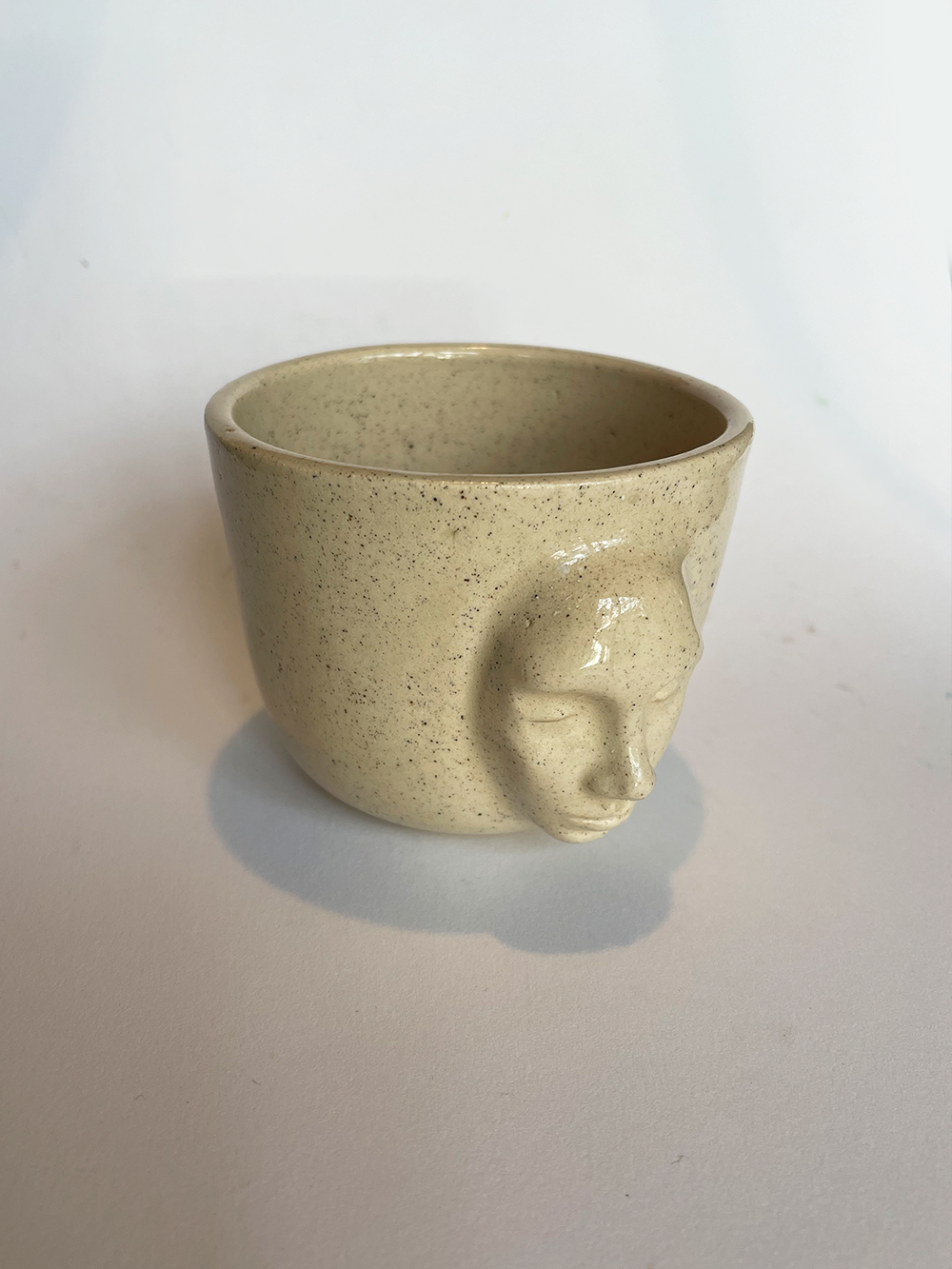Vaso o adorno hecho a mano, primero en torno y cara esculpida en cerámica gres, con esmalte transparente.